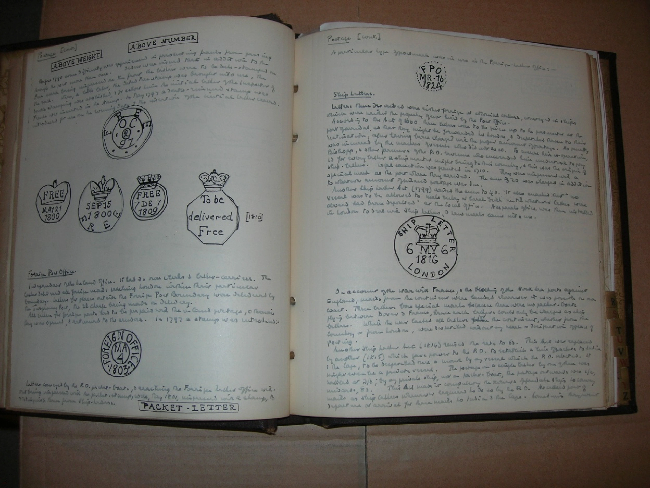 Ms. Kloester felt it was a possibility that the book belonged to Heyer, but was swayed in the end toward the negative by the fact that none of the handwriting she personally had samples of was a dead-match for the handwriting in the dictionary. Consequently, the choice of words and subjects wasn’t a closer for her. She sent photos of the research notes she had that Heyer had written. To my eye, there’s an undeniable similarity; both hands were very small and very tight, and more important, once again, all sketches have the formalized headings with added serifs that appear in the dictionary. (I've posted these samples below.)
