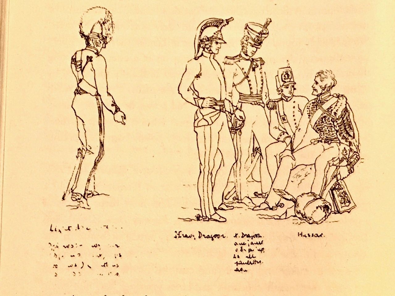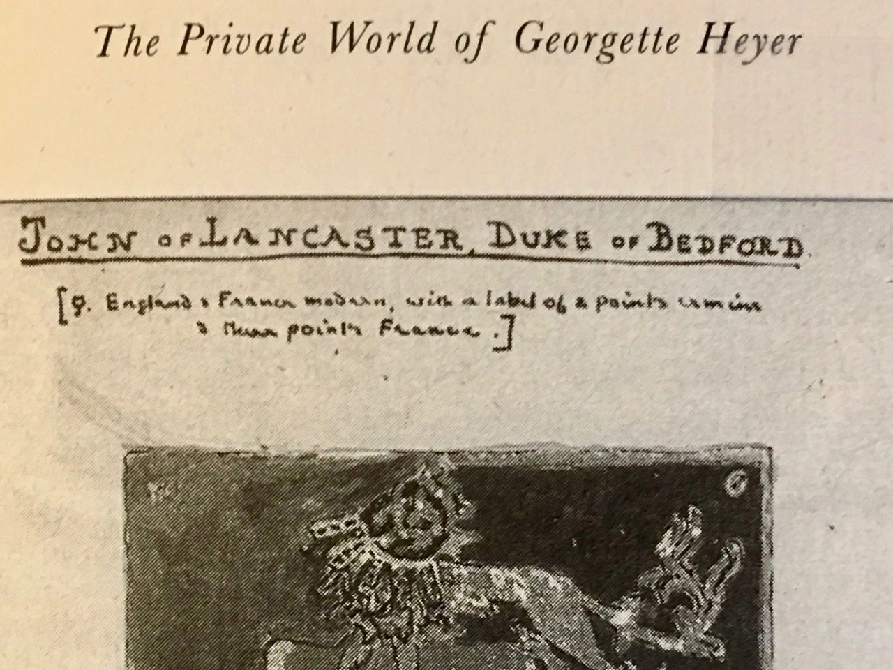 The seller posted a picture, and to my surprise, I felt a little lurch of recognition. By sheer chance I’d recently read Jane Aiken Hodge’s biography, The Private World of Georgette Heyer, and I thought I recognized some of the unique handwriting, including a larger first letter with added serifs, aping illuminated manuscripts and calligraphy. I’d seen it in a very clear picture in Hodge's book, a heading on one of the drawings in Heyer’s meticulous research notes. However, I didn’t take it very seriously, assuming it was just a coincidence. But out of the four versions available, this one was overall the nicest, and very prettily bound, a thing I can never resist, so I bought it.