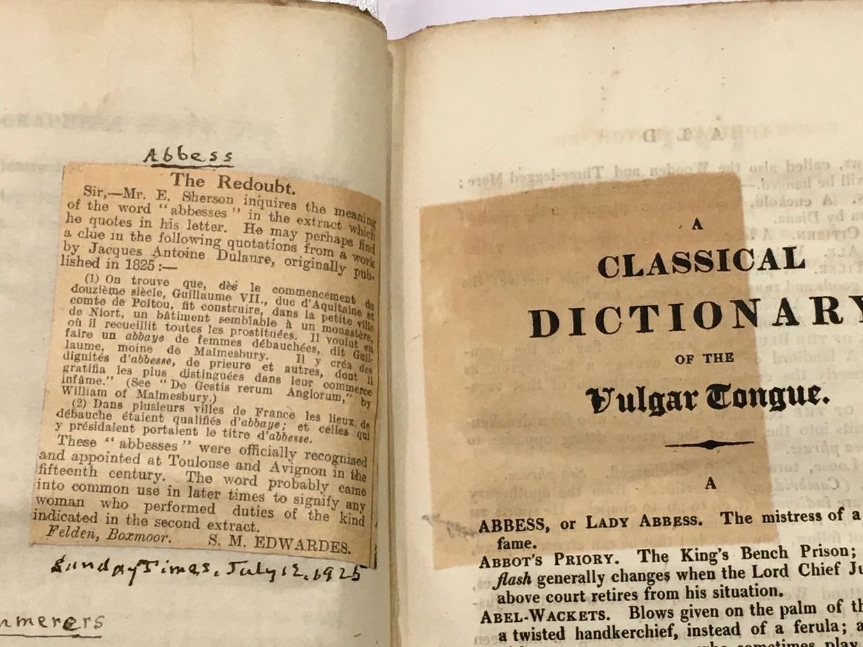 Researchers don’t usually buy books that have been mucked up. I don’t want to try to read through someone else’s notes and highlighting. But the description from the bookstore said this thing was doubtless the property of a writer, which interested me. They thought it might have belonged to Eric Partridge, the great 20th century lexicographer and slang expert, a man whose work I knew well. They thought it might have been a research tool for a new, annotated edition of Grose he published in 1931, but when they checked, the handwriting wasn’t a match. Also, the additional material at the back had nothing to do with slang, and was just too specific on things that would probably only interest someone writing an historical novel.