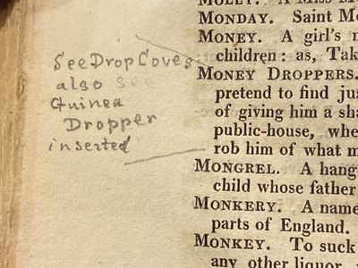 I felt Georgette Heyer specifically in some of the added words themselves, odd words I’d only seen in her novels - for example, the word “tirewoman” is notated with its 17th century source, a word I had in my own notes, since I'd never encountered it anywhere but Heyer. The sources for the handwritten additions run the gamut, from earlier, 18th century cant dictionaries to forgotten Grub Street works like The Anti-Pamela, comic novels like The History of Pompey the Little, even 17th century songs. (The works referenced in the dictionary are listed at the close of this article.)